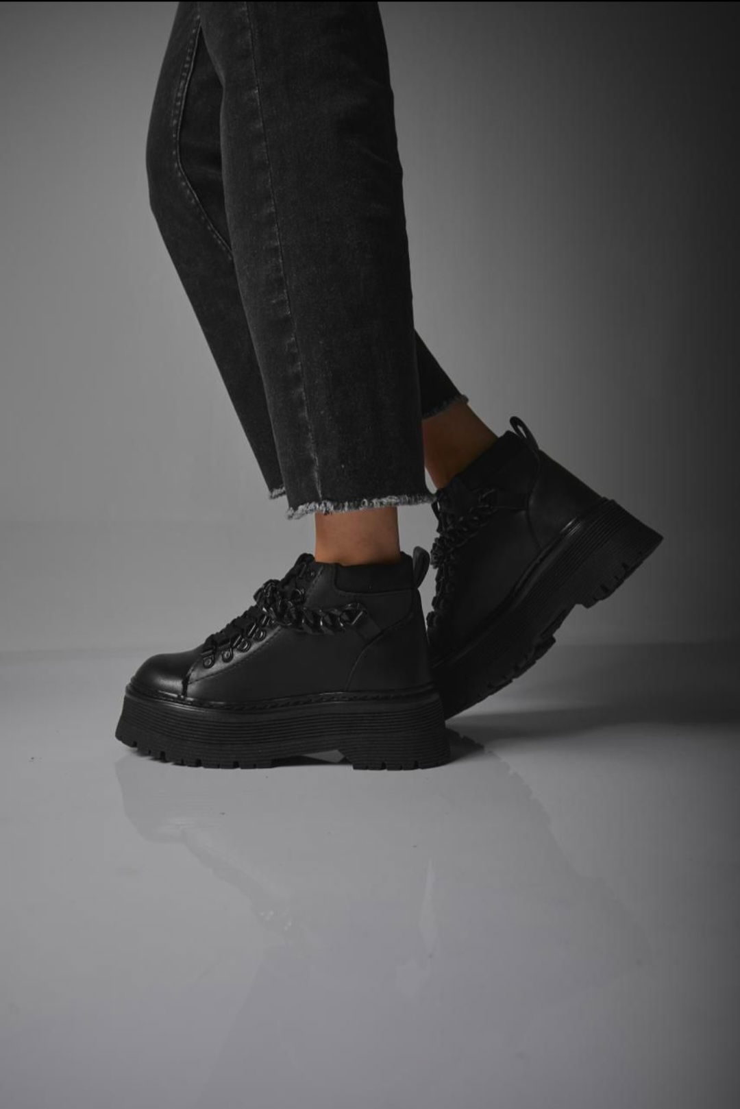Borcegos caña corta, acordonados, con hojales de metal, y cadena de deco (la podes usar adelante o atras)