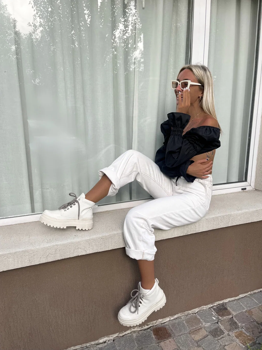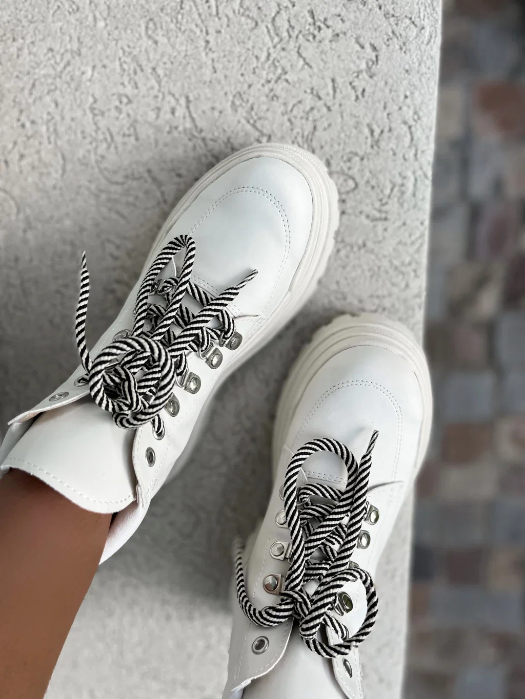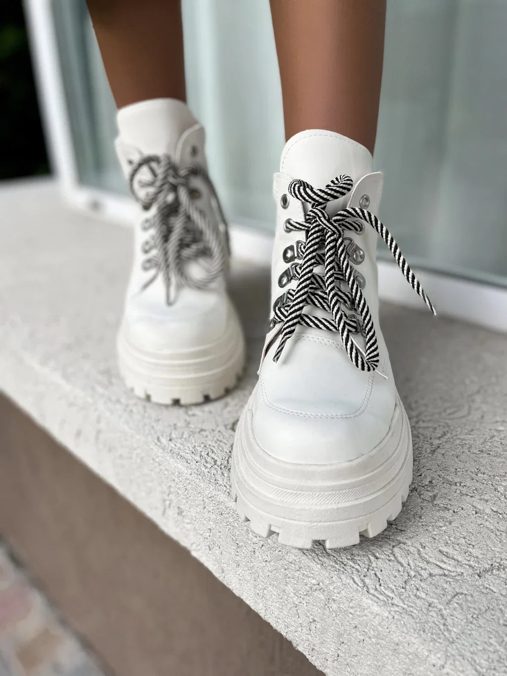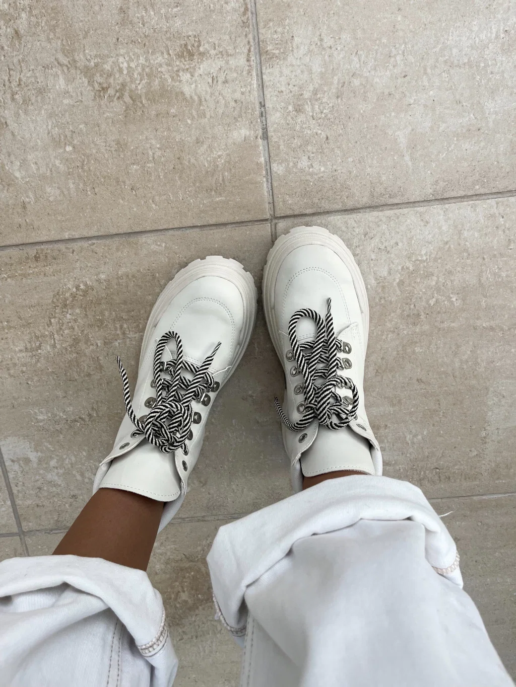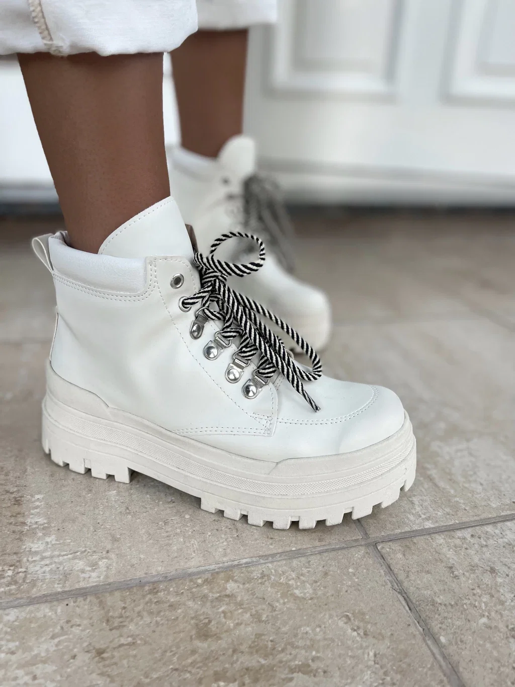 Borcegos caña corta, acordonados. Con ojales de metal, color plateado y cordones combinados Manteca y Negro.