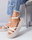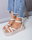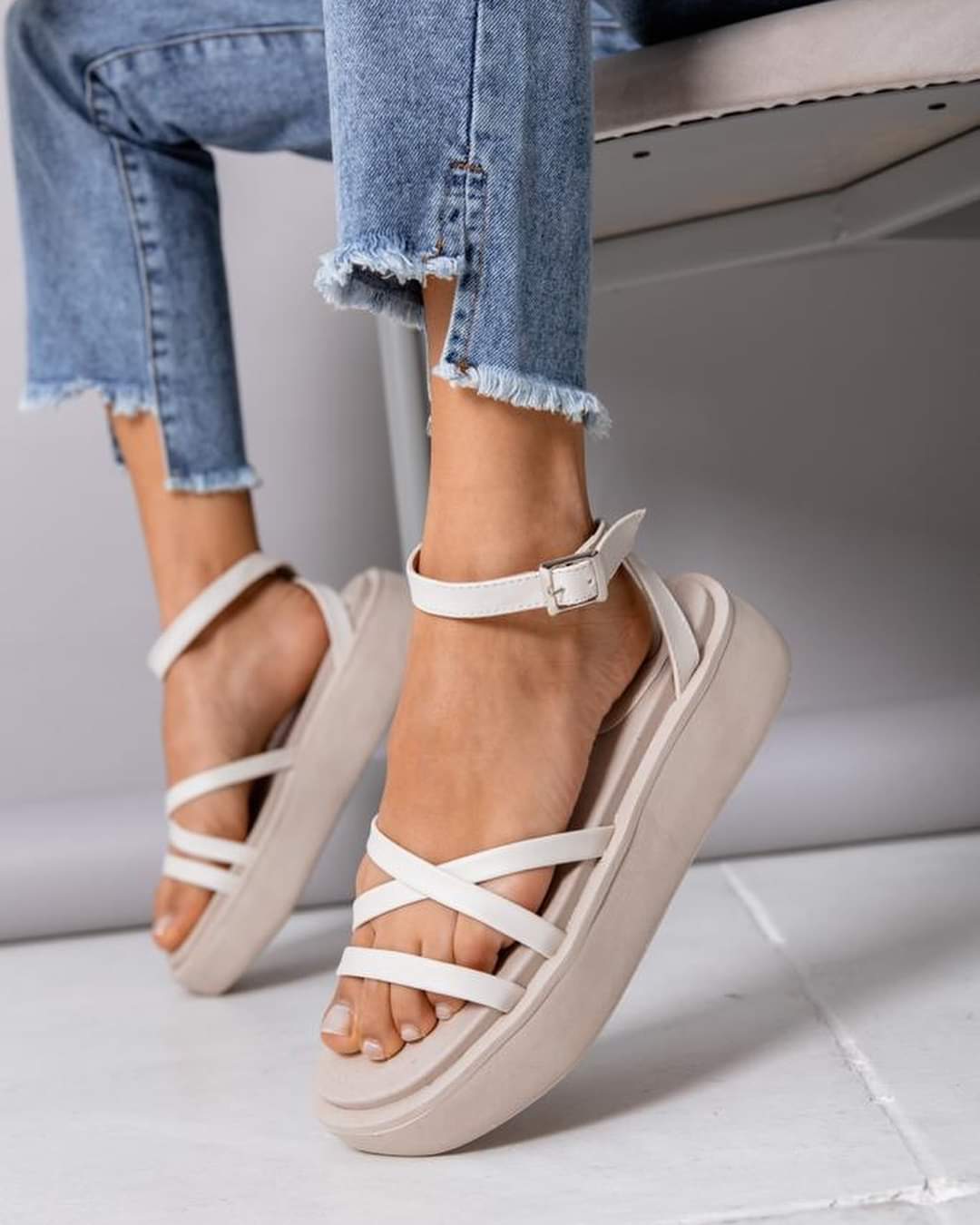 Sandalias con triple tira cruzada, con pulsera y hebilla regulable. Cuero ecologico. 100% Cruelty Free