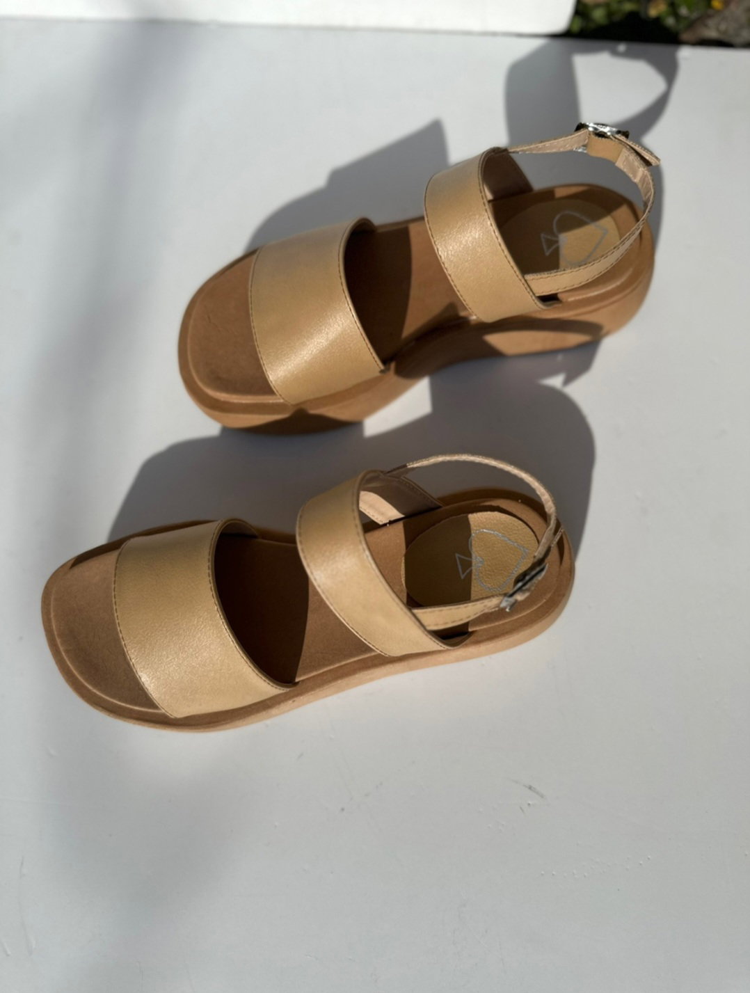Sandalias con una franja, con pulsera y hebilla regulable. Cuero ecologico. 100% Cruelty Free