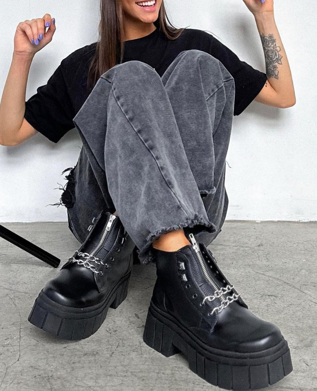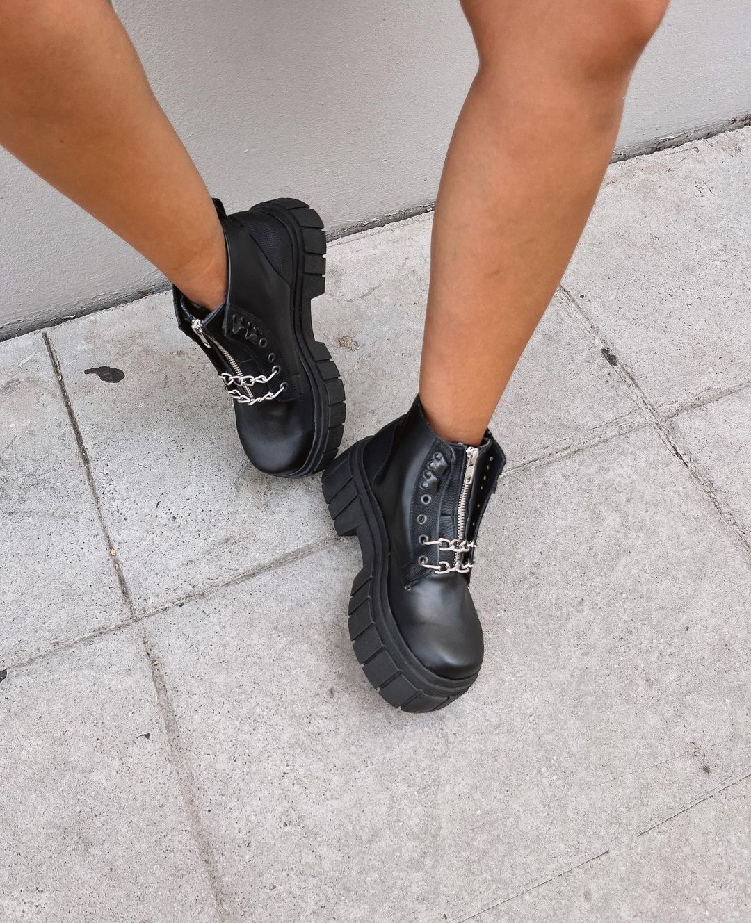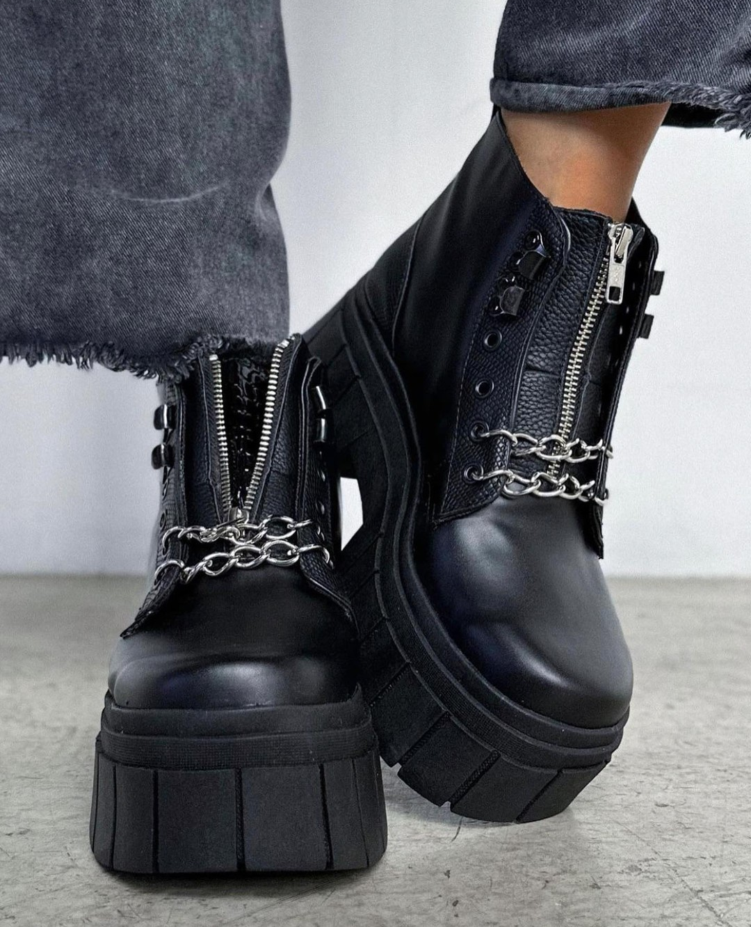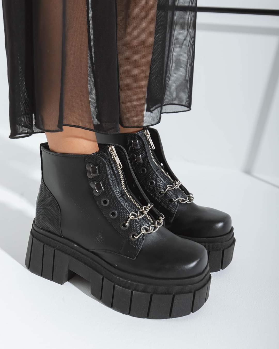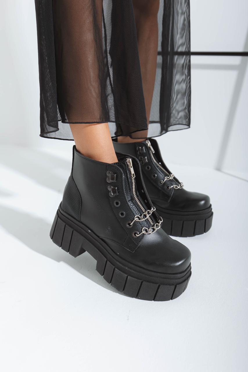 Borcegos caña corta, con cierre y dos cadenas. Y detalles en cuero croco charol.