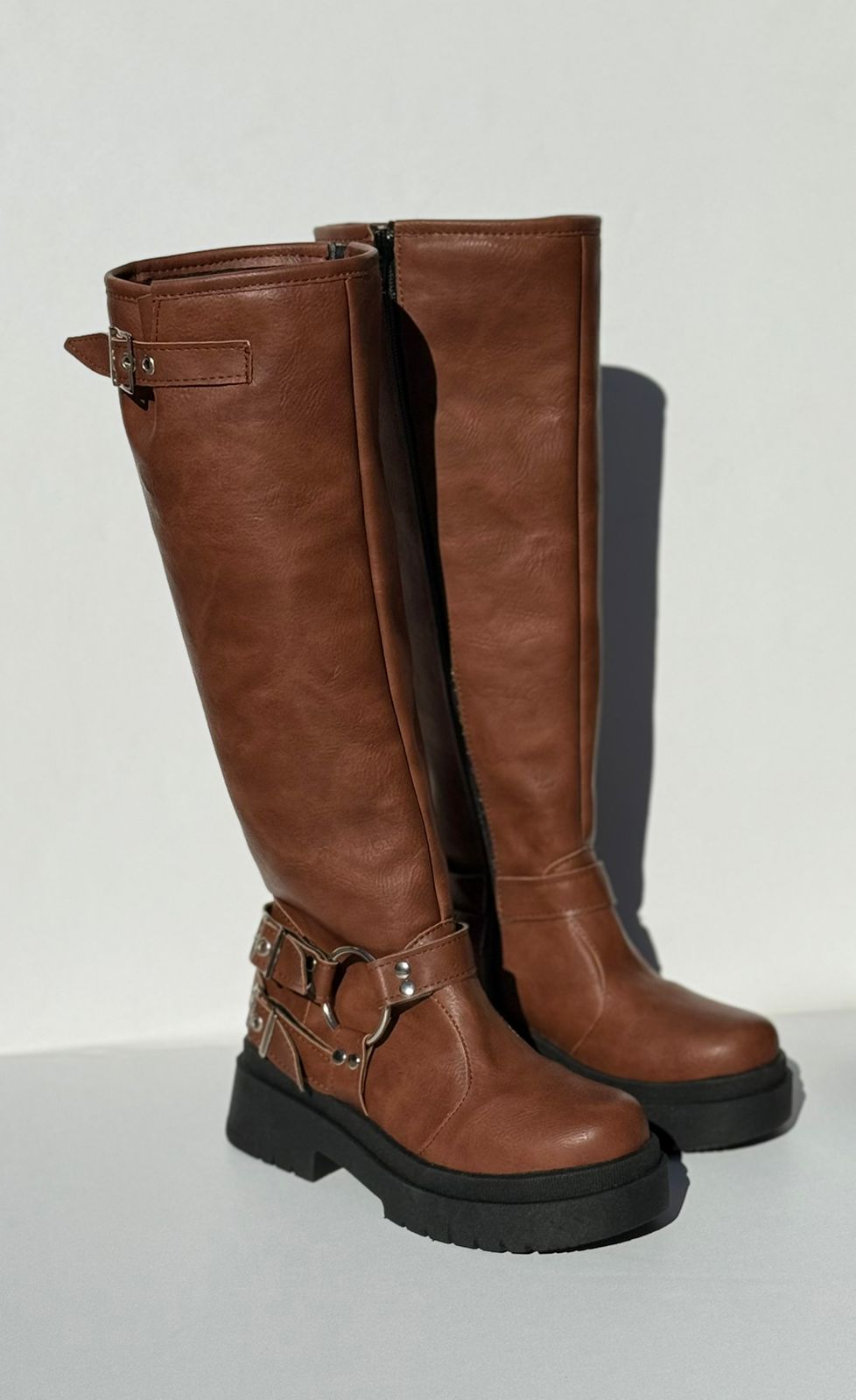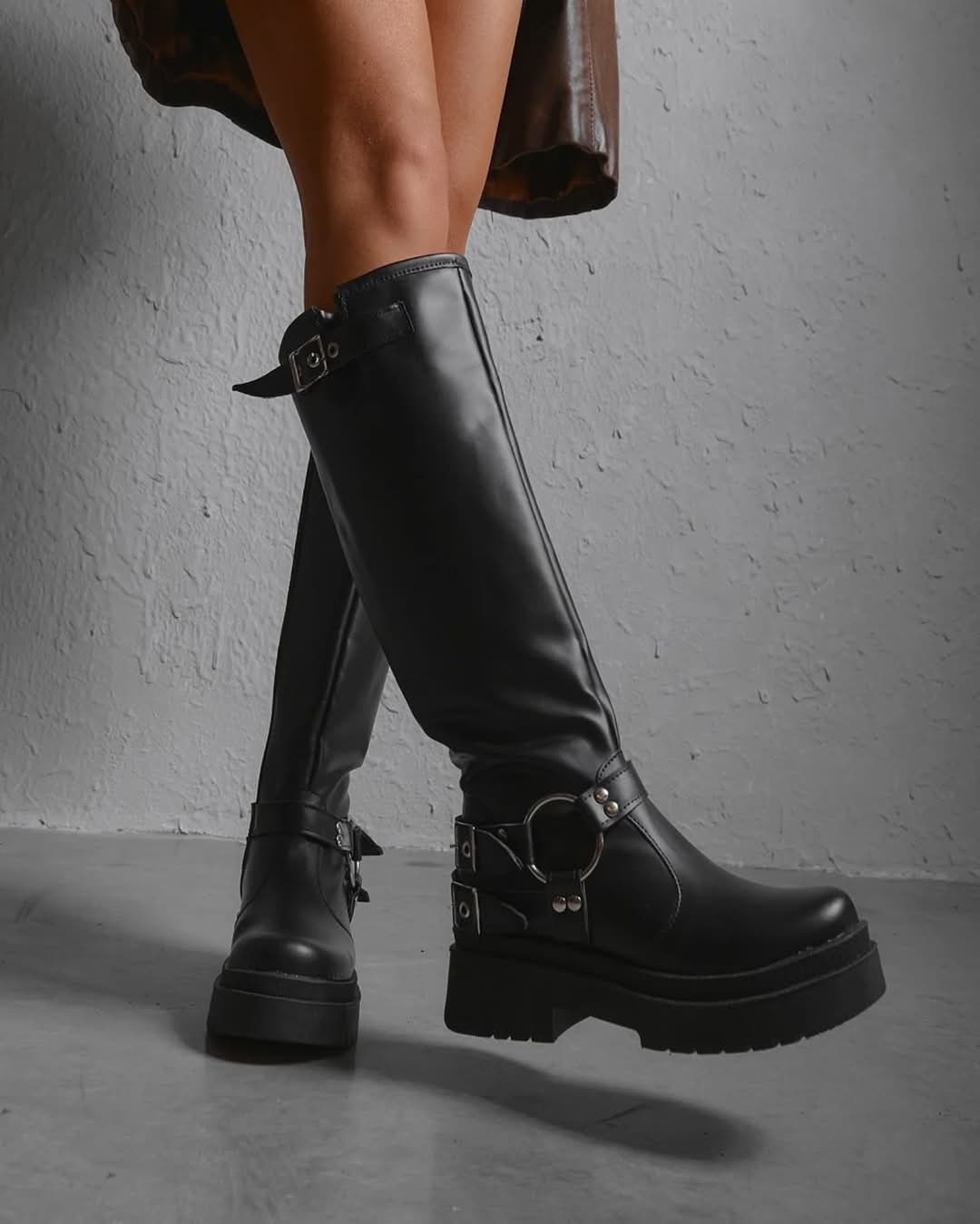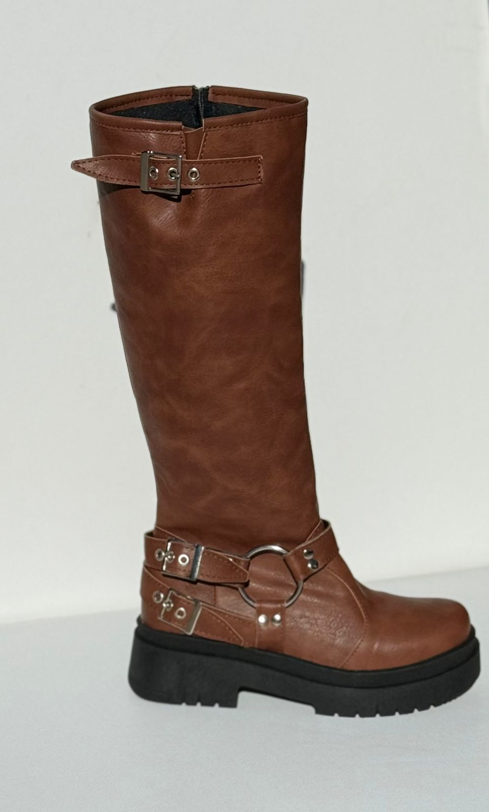 Bota caña alta, con cierre lateral interno, tienen estribo y 2 hebillas regulables, ademas en la parte superior.Cuero Ecologico,100% Cruelty Free