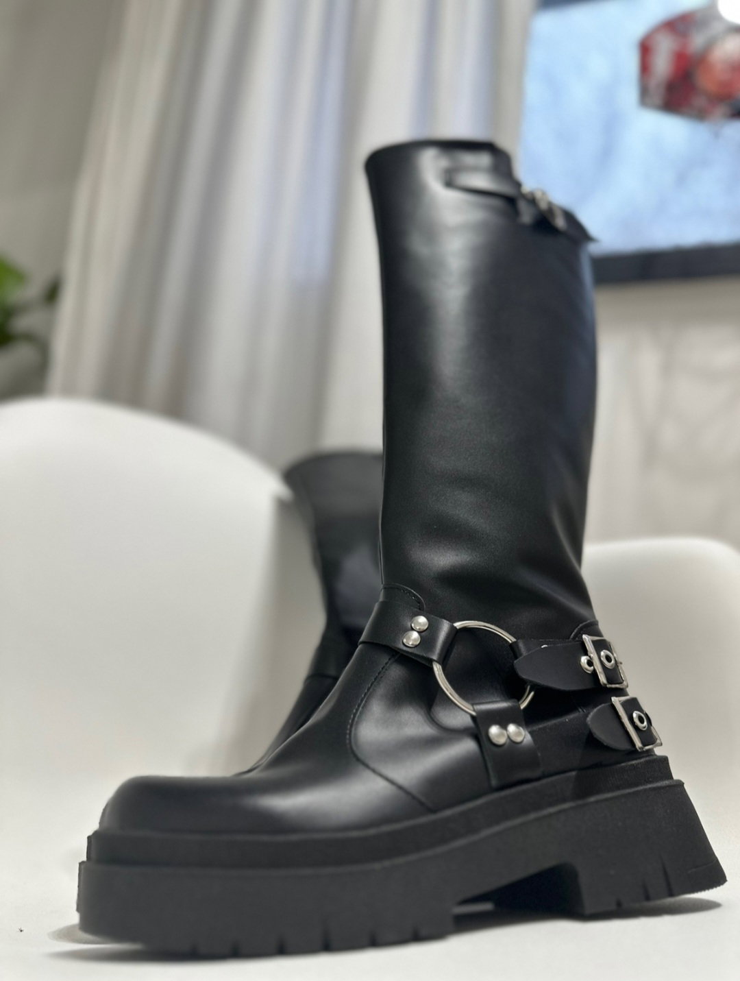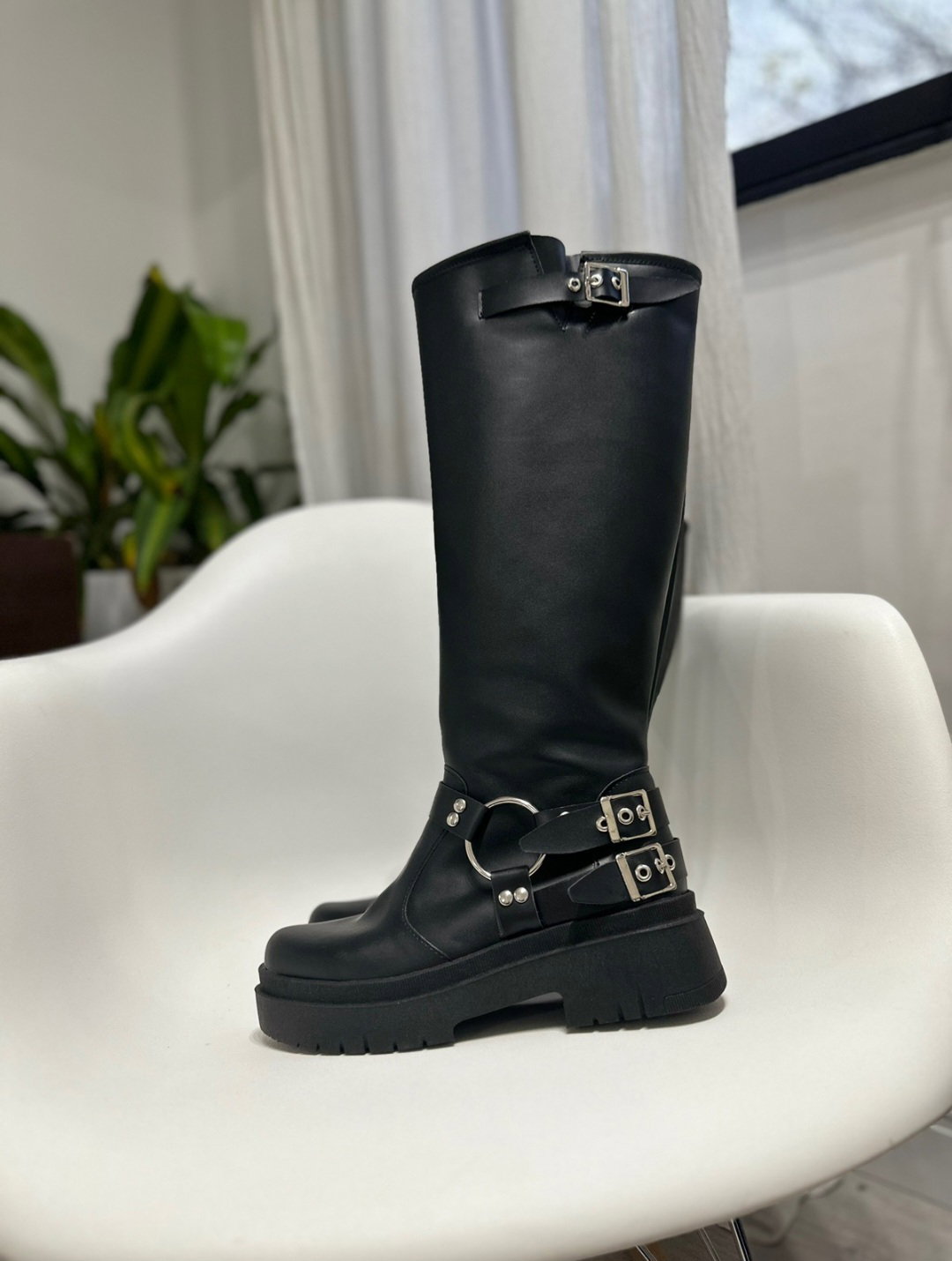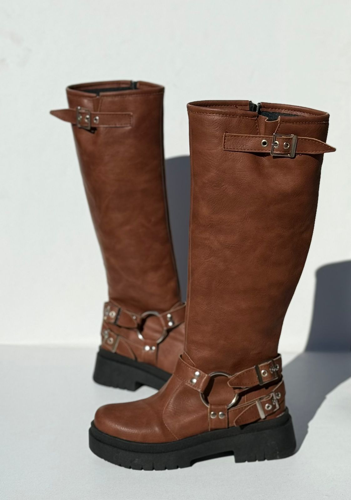 Bota caña alta, con cierre lateral interno, tienen estribo y 2 hebillas regulables, ademas en la parte superior.Cuero Ecologico,100% Cruelty Free