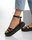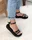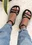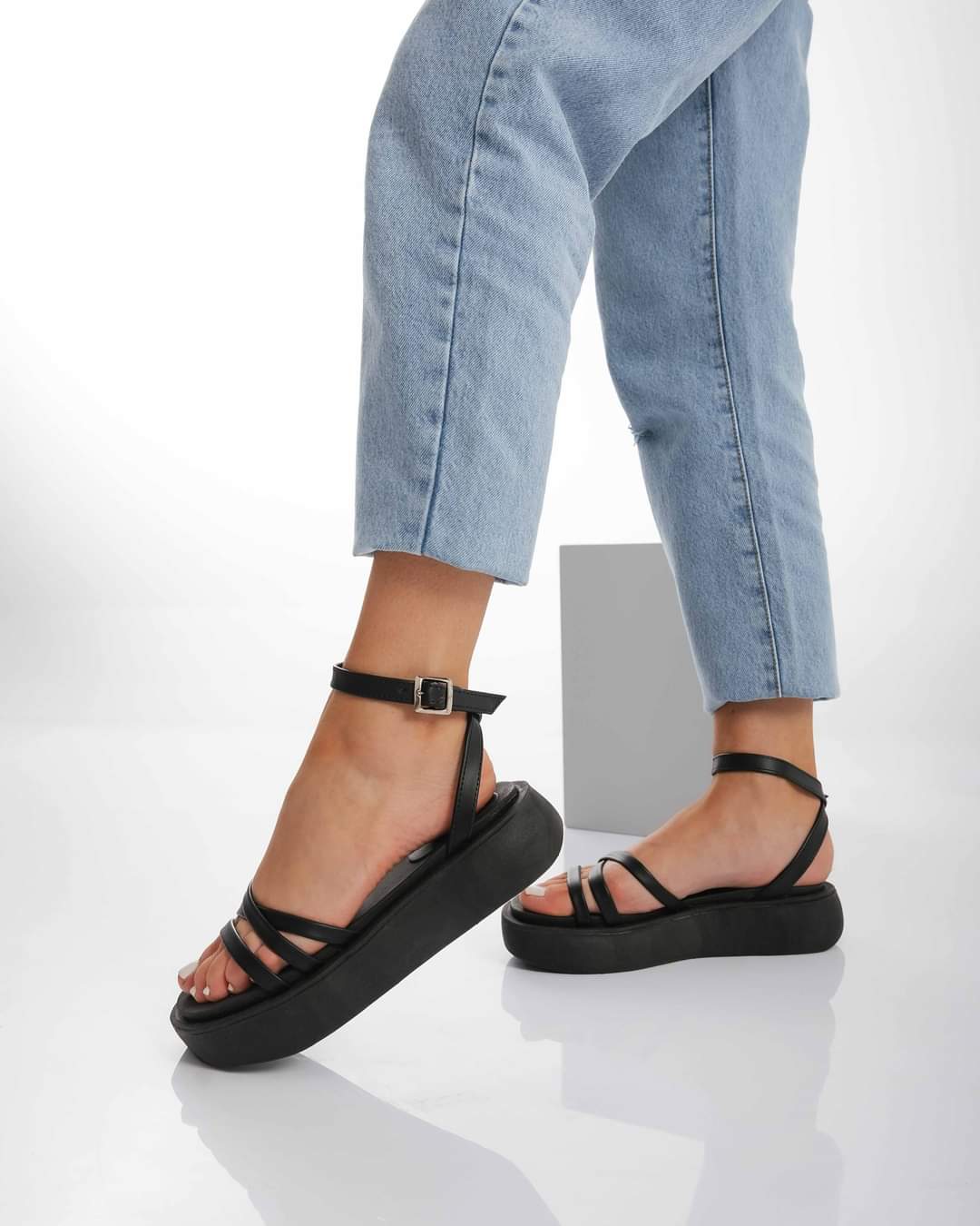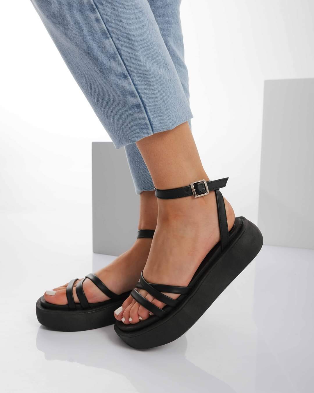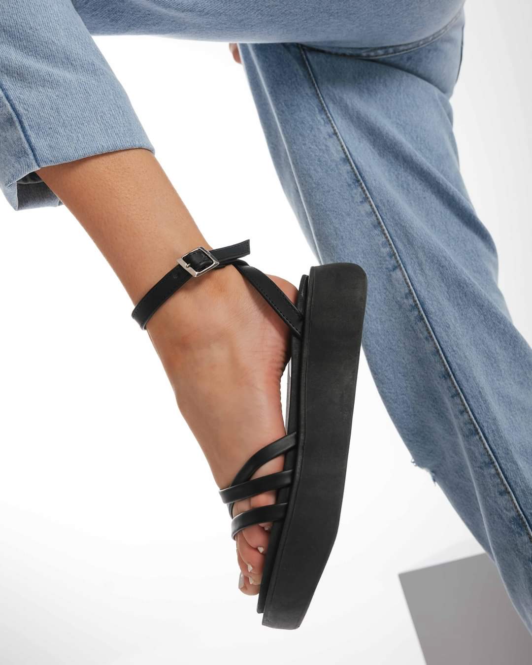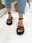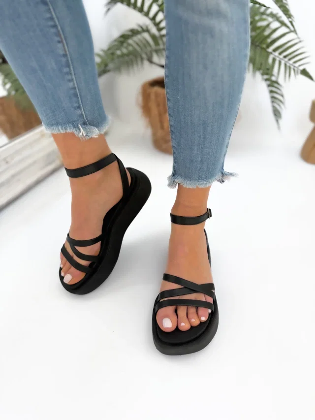 Sandalias con triple tira cruzada, con pulsera y hebilla regulable. Cuero ecologico. 100% Cruelty Free